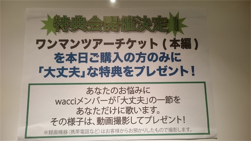 そして、この日だけのスペシャルな特典として、会場にてツアーチケットを購入した方にはwacciが個別に「お悩み相談」に乗り、目の前で「大丈夫」を一節歌うという催しが行われた。悩みに対し一生懸命相談に乗り、しかも目の前で自分のためだけに歌ってくれるwacciに対し、ファンは大喜びであった。