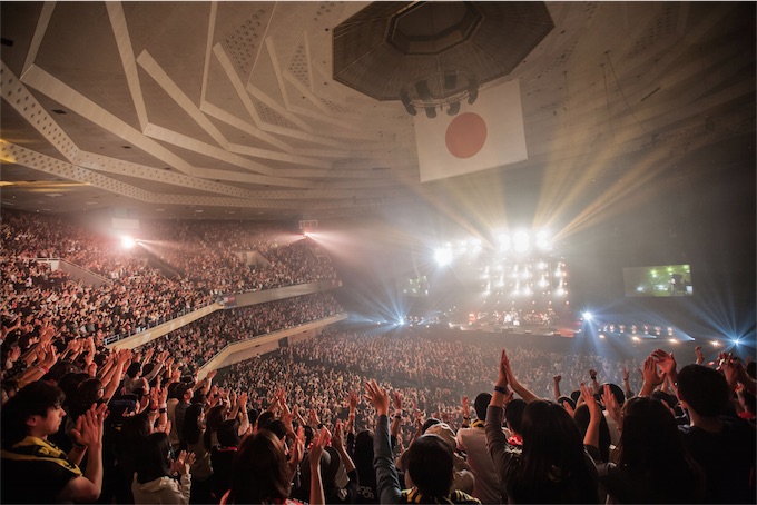 日本武道館公演は2013年11月の【YOU CAN BREAK THE SILENCE IN BUDOKAN】以来。更に2Daysは初。その2日目の12月6日(日)。開演前の会場では、中央に「笑」と書かれたツアータオルが踊っていた。星座を繋ぐように光るタイトル。エレキギターが“今を駆け抜けて”のイントロを鳴らすと、オーディエンスはオープニングからテンションを上げる。力強くも切なさをはらんだ高橋の歌声とその表情は、両脇の大型スクリーンに歌詞と共に映し出されていた。「一緒に叫ぼうぜ、武道館!」「見えてるぞ二階席!聞こえてるぞ一階席!騒ごうぜアリーナ!」 続く“(Where’s)THE SILENT MAJORITY?”でも高橋は、ロックバンドのヴォーカルみたく煽り続ける。攻めるその表情が笑顔になったのはアウトロの少し前。