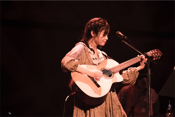 そんな会場の空気を変えたのはまたもや、ゆるゆるのMC。ノリ突っ込みも披露して再びほんわかした空気に。そしてそんな空気感のまま始まったのは「ここからはピアノを弾いて…。(藤原)さくらに貸してもらったCDをヒントに作りました」という『だってネコだから』。ここまでとはまったく異なるドリーミーな側面には、思わずドキリ! 歌声もガーリーでその表情もまた柔らかだ。ジャンプしてピアノの陰からハンドマイクで飛び出すひと幕は、まるでネコのそれのよう。ライブでネコまでも表現できる彼女の表現力にはアッパレ!だ。そして、フィナーレに向かって華やかで起伏ある2曲をプレイ。「これから一緒に歌を歌いませんか? 同じ気持ちでここに思いを届けて!」という言葉から始まったのは『僕たちの未来』。壮大なコーラスワークのイントロが野外ライブのような開放感を作り出し、さらに濁りのない歌声と突き抜けるようなメロディで圧倒的な爽快感をプラス。観客は手をステージに伸ばしつつ「OhOhOhOh、OhOh」のシンガロングも! 会場全体で一つの音楽を作り上げているような感覚になる。そして最後は7/26リリースの最新シングル『ずっと、ふたりで』。愛に向き合う真摯な言葉で綴るドラマティックでせつないメロディは、聴く者の心をつかんで離さない。男女問わず誰もが舞台を凝視したまま頷くように聴き入り、最後の最後まで美しい曲と歌声に思い残すことなく酔いしれた。