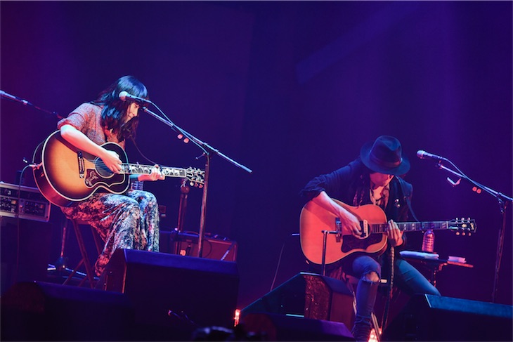 続いて登場したのは、4年ぶりの新作『LOVE YOUR LOVE』を携え、現在、全国ツアー真っ最中のLOVE PSYCHEDELICO。今回は、世界的パーカッション奏者であるレニー・カストロを交えたスペシャルなアコースティックセットでオン・ステージ!広い空間に響くギターアンサンブルのクリアな音色が耳心地よく、久しぶりの大阪城ホールでの演奏をふたりも心から楽しんでいる様子。映画『昼顔』の主題歌を描き下ろした『Place Of Love』では、赤い照明の中、その叙情的な世界観と美しいメロディに耳を奪われる。余韻にひたっている間もなく一転し、ブルーの照明の中スケール感のある『裸の王様』を。そしてヒット曲 『Last Smile』では、アコースティックセットでよりきわだつ言葉の響きとリズムに思わす体が揺れてしまう。「よかったら踊ってね!」と披露されたのは、彼らには珍しい血が沸き立つラテンロックナンバー『Might Fall In Love』。「青山学園大学で出会ってふたりで音楽をはじめて、17年たった今もこうやって演奏できるのがうれしいです」と、ファーストアルバムに収録の『Your Song』も披露。そして、ブルージーなスライド・ギターに見惚れる『LADY MADONNA~憂鬱なるスパイダー~』では、レニーとともに鉄壁のグルーブを生み出し、40分のライブを終えた。新機軸となるラテンナンバーやデビュー当時のヒット曲など新旧織り交ぜたセットリストが楽しく、それ以上に、純粋に音をロックを楽しむふたりの姿が印象的だった。