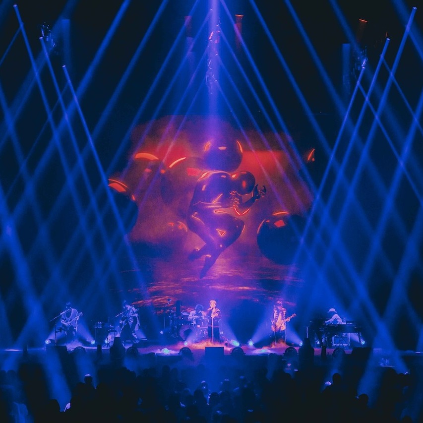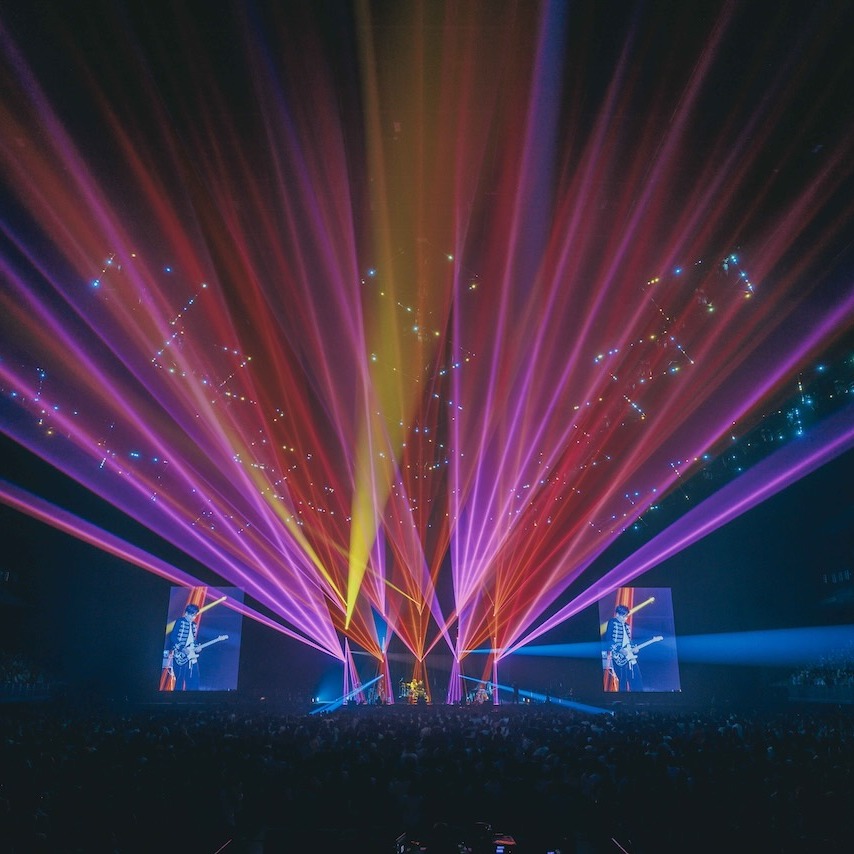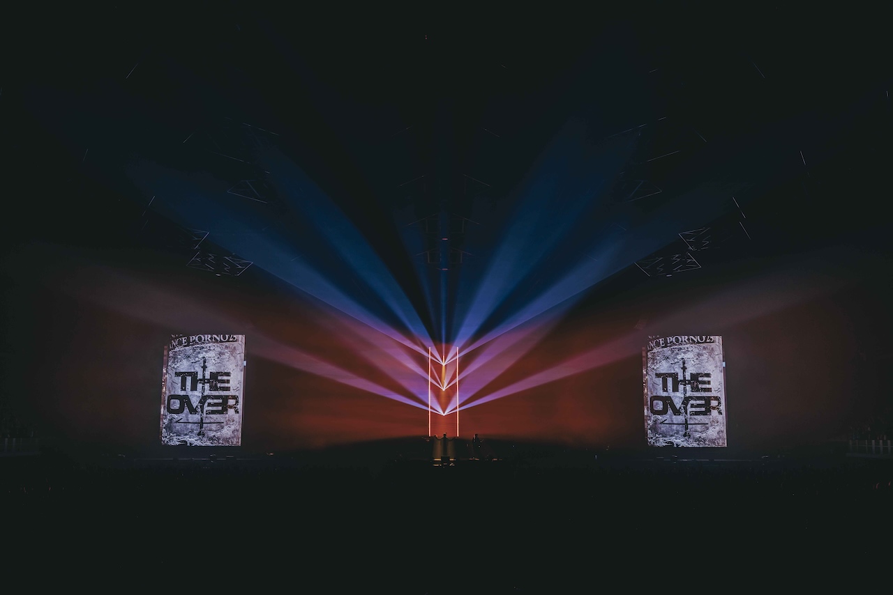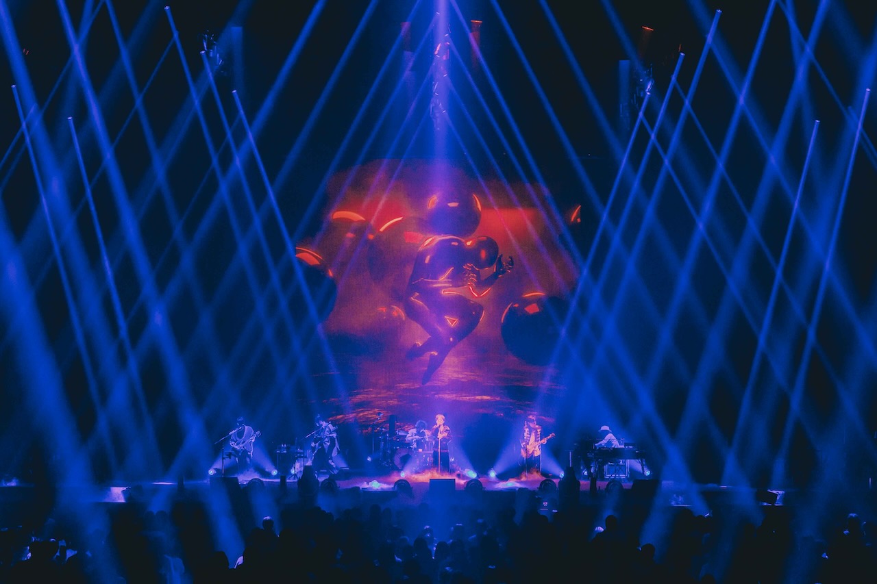 「さっきまでのサイバーやオーガニックな世界から反転させ、違った世界に皆さんを引き摺り込みます」と意味深なMCから始まった「ラック」で、会場のボルテージは最高潮に。作詞家としての新藤の唯一無二な世界線が光る「悪霊少女」へと続き、耳にこびりついて離れない金属音から始まる、よりヘビーな楽曲「鉄槌」では、観客の頭上から数えきれないほどの無数の光の柱が会場中を埋め尽くし、まるで鉄格子に閉じ込められたかのような空間へと誘った。「鉄槌」の世界そのままに新藤とサポートミュージシャンとで織りなすInterludeでは、照明とレーザーが音楽に呼応するかのように演出され、ダークなブロックの終焉を暗示させるような1つの物語を見たようである。先ほどまでの暗闇を切り裂くように始まった「2012Spark」では、ダイナミックな岡野のボーカルが印象的で、これぞポルノグラフィティと言える、2025年を締めくくるに相応しいパフォーマンスだったのではないだろうか。