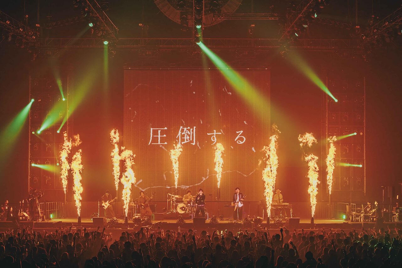落ち着いたピアノフレーズで始まるイントロからだんだんと熱が宿り壮大に展開するメロディは、まさに革命と言うに相応しく、サビの「神聖なMOVE SILENT VOICE THE DAY HAS COME」での大合唱では、メンバーとファンとの絆を感じられるほどでこの日のためにつくられたかのように、楽曲の持つ力強さが最大限に引き出されていた。アウトロにさらにピアノイントロが復活し、楽曲としての反転を覚えるような『THE OVEЯ』オリジナルアレンジには、この日だけの特別な歌詞が乗り、改めて2026年を大団円で迎えた喜びをライヴに参加した全ての人が分かち合えたに違いない。気づけばステージから、メンバーそして観客を大きな光が包み込み、今年の行く先を指し示すかのように照らされた光景は、2016年のライヴ『THE WAY』から続く道を今回のライヴで答え合わせするかのようで、圧巻の一言に尽きる。