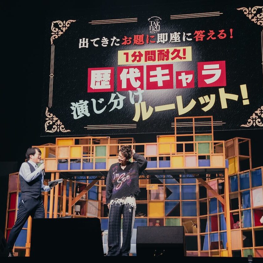 今回のテーマは「これまでの20年を支えていただいているファンの皆さまへの感謝」。イベント開催に向け、「あなたとたけるのエピソード『たけエピ』」と題して事前に、佐藤にまつわる思い出を公式ファンクラブ「CANDY」で募集。その中から選ばれた数々のエピソードは、ステージ上で映像や写真と、キャストによる生の芝居を交えて展開され、佐藤が舞台袖で見守りながら掛け合いをする、といったメタ演劇の手法を用いたスペシャルな回想演出となった。それぞれのファンの思い出と共に、過去出演作品の映像や写真が次々と会場スクリーンに映し出されると、客席からは懐かしさと歓喜の声が沸き起こった。さらに、各エピソードでは佐藤への無茶振りにも近いリクエストが次々にぶつけられていく。過去に佐藤が演じてきたキャラクターの代表的なセリフの実演を求められる「歴代キャラ演じ分けルーレット」では、照れながらも全てのリクエストに応じる佐藤の姿に、会場は大きな盛り上がりを見せた。