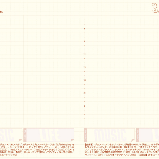 日めくりカレンダー366日全ページに掲載している、音楽/カルチャー関連の<出来事>と著名アーティストの