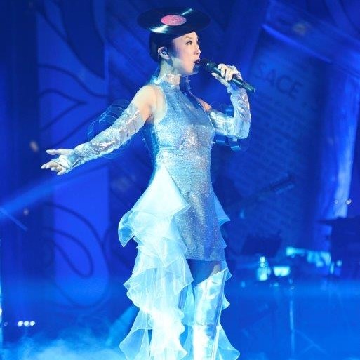 前半からは一転、時は未来へ。アナログ盤のヘッドアクセサリーにシルバーのスペーシーなドレスで登場。テーマのデニムとは真逆の世界観の衣装の中にも、ヴィンテージデニムのディティールの様なバックポケットの隠しステッチが施されている。また、ヘッドアクセサリーのアナログ盤は78年6thアルバム「流線型 ‘80」のアナログ盤そのものを加工し制作されたもの。過去の芸術がその形を変えて、新たな価値観を生み出したアイコンのようにポイントとなっている。