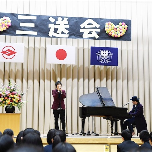 生徒に見つからないよう3年生全員が歌う「奏(かなで)」を舞台袖で見守りながら聞き終えた後サプライズで登場したスキマスイッチに、生徒たちからは割れんばかりの歓声と拍手が巻き起こった。興奮冷めやらない中、生徒たちの合唱する「奏(かなで)」に感動したメンバーより、「お礼に新しい門出を迎える卒業生へのエールを込めて新曲「未来花(ミライカ)」を歌います」と切り出すと再び大きな拍手が。「未来という花を咲かせよう」と歌う新曲「未来花(ミライカ)」に感銘し涙ぐむ3年生の姿も多く見受けられた。最後には全校生徒との記念撮影も行われ、上尾中学校の生徒には忘れられない一日となり、三送会の幕は閉じた。